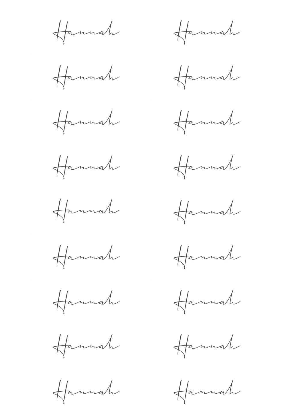 Einfache weiße Tischkarten zur Hochzeit mit schwarzer Schrift in 8x3 cm. Auf einem Blatt befinden sich 18 Namenskärten. Bitte trefft eine Vorauswahl über die Anzahl der benötigten Blätter á 18 Kärtchen vor Beginn der Gestaltung.