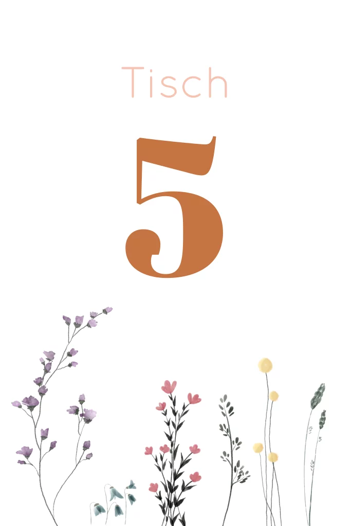 Tischnummer für die Hochzeit in weiß mit Blumenwiese und kupferfarbenen Nummern