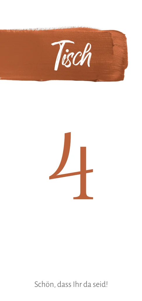 Moderne weiße Platznummer mit Pinselstrich und Zahl in Rostbraun. Diese Karte verschönert die Tische Eurer Hochzeitsgäste im passenden Design Eurer Hochzeitskarten.