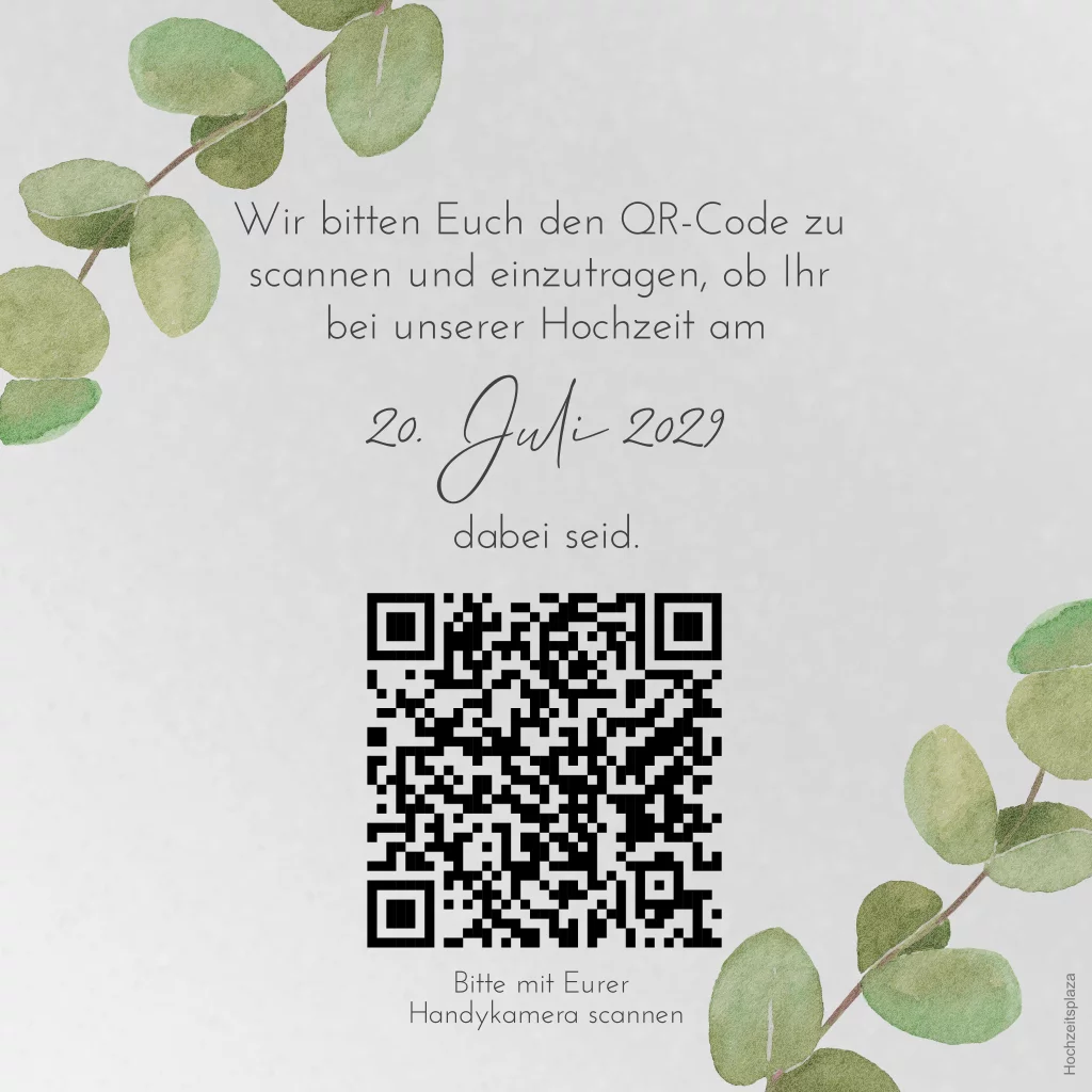 Quadratisches Einlegeblatt als Antwortkarte zur Hochzeitseinladung. Das transparente Blatt mit QR-Code und Eukalyptus ist ein tolle Idee, um schnell und einfach zu erfahren wie viele Gäste bei Eurer Hochzeitsfeier dabei sind.