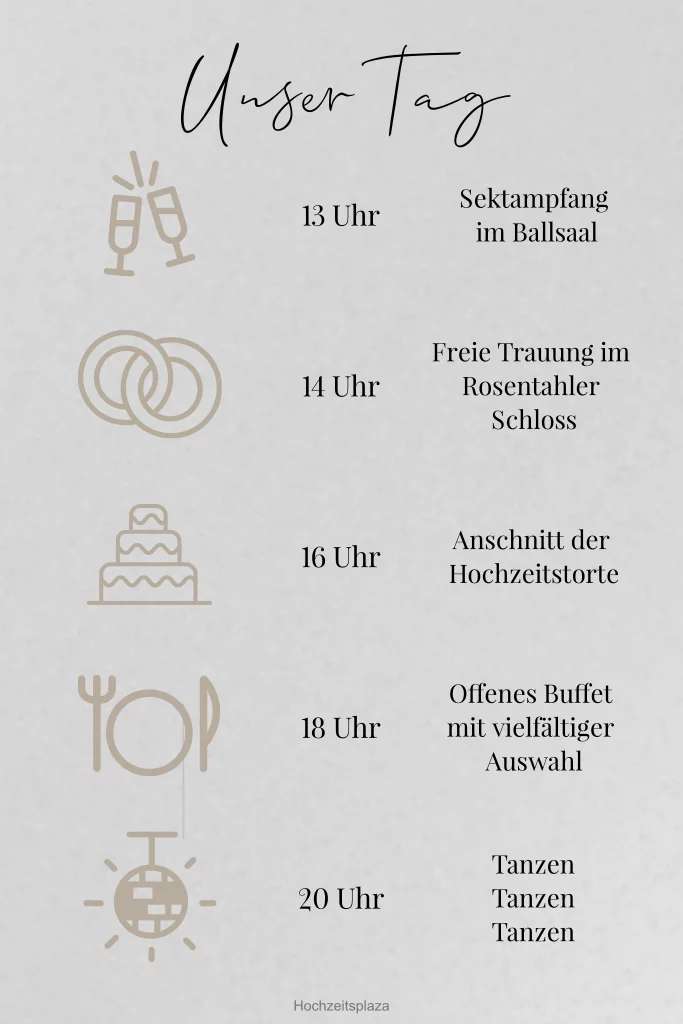 Einlegeblatt zur Einladungskarte aus Transparentpapier mit Timeline im Hochformat. Die Hochzeitsicons in beige zeigen auf einfache Art wann welcher Programmpunkt am Tag der Hochzeit ansteht.