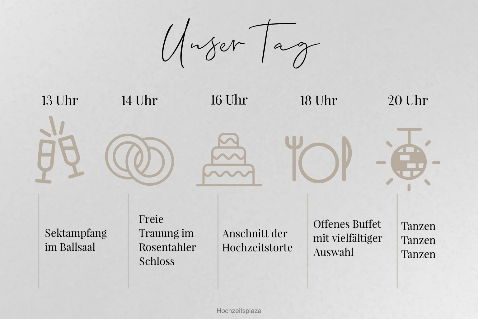 Schlichtes Einlegeblatt zur Einladungskarte mit Hochzeitsicons in beige. Die Transparentpapier Karte im Querformat mit Timeline gibt Euren Gästen einen Überblick über das Hochzeitsfest.