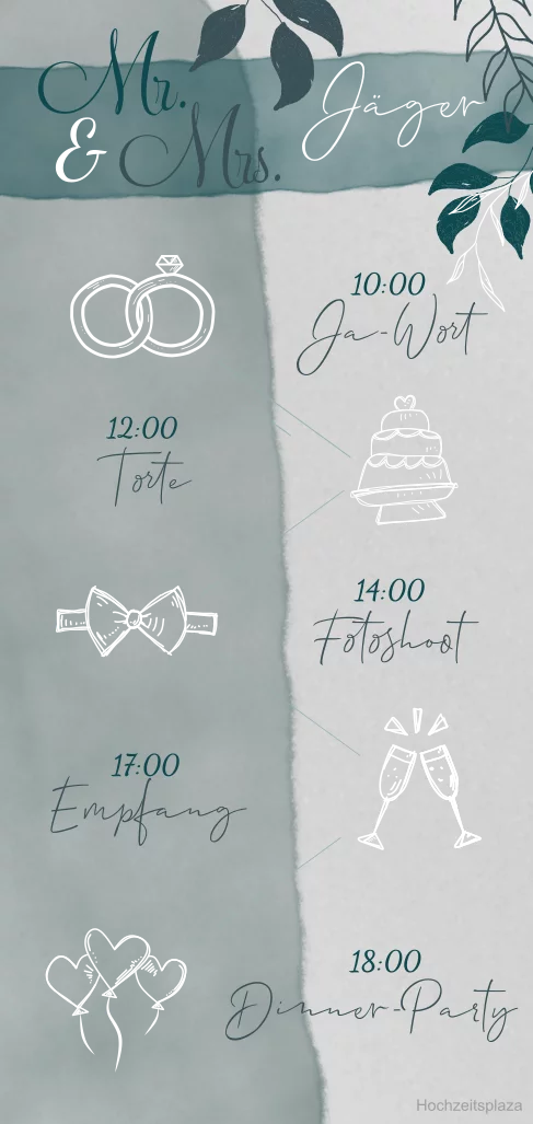 Einlegeblatt zur Hochzeitseinladung aus Transparentpapier. Karte im Hochformat mit Timeline, Hochzeits-Icons mit Silberfolierung und blauen Akzenten.
