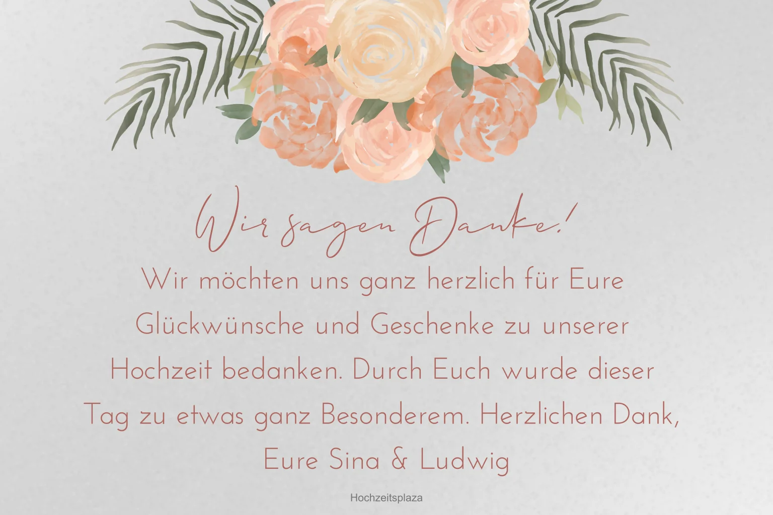 Florale Danksagung zur Hochzeit aus Transparentpapier mit Rosen in rosé und rosa und Palmenblättern.