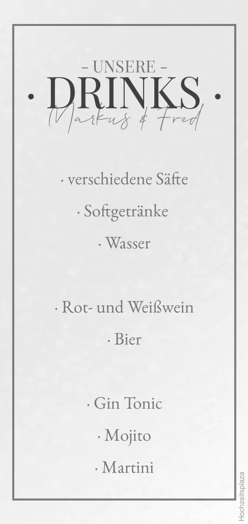 Minimalistisches Drinksmenu zur Hochzeit aus Transparentpapier mit Rahmen. Die schlichte, aber moderne Karte lässt sich perfekt als Einlegeblatt in der Menükarte zur Feier nutzen.