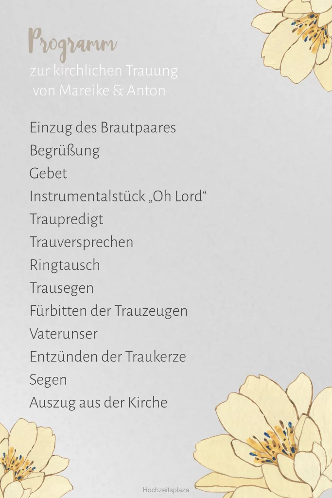 Dieses einzigartige und moderne Kirchenheft ist perfekt für Hochzeitsfeiern! Das Kirchenheft besteht aus transparentem Papier und ist mit wunderschönen Blumenverzierungen in Gelb- und Beigetönen versehen. Die Blumen sind perfekt ausgewählt, um eine ruhige und natürliche Atmosphäre zu schaffen.