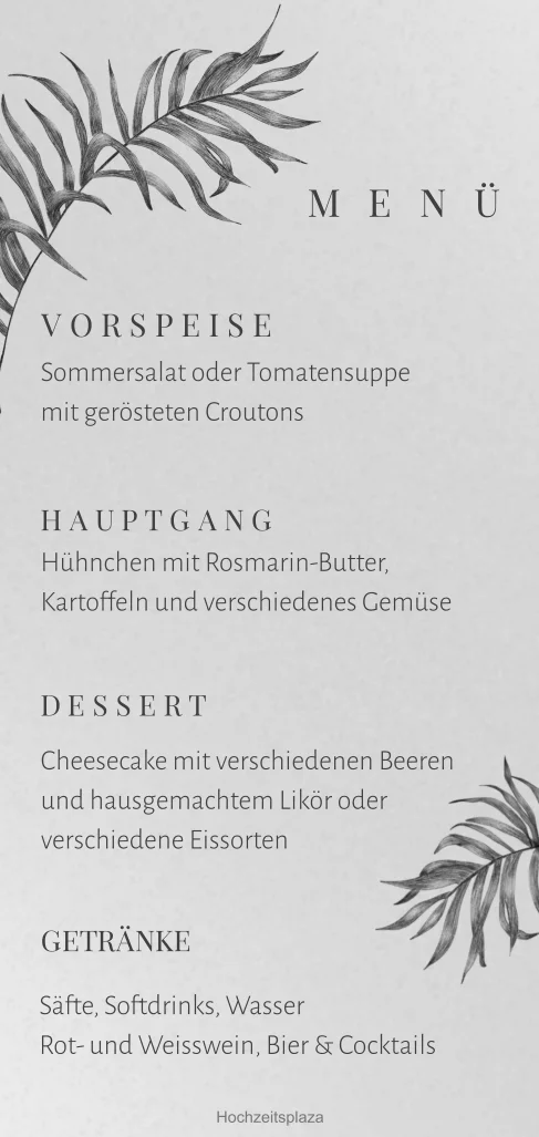 Die Speisekarte zur Hochzeit mal anders. Das transparente Blatt als Menükarte mit Palmenblättern in schwarz ist ein schöner Hingucker bei Eurem Hochzeitsessen.
