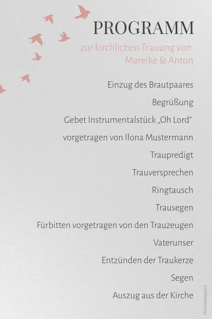 Kirchenprogramm für die kirchliche Eheschließung aus Transparentpapier mit Tauben in altrosa.