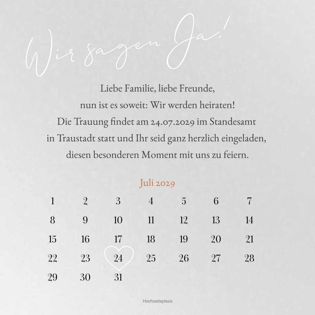 Transparente Einladung zur Hochzeit mit Kalenderblatt und Herz, um den Tag zu markieren. Das Kalenderblatt ist mit holografischer Folie veredelt.