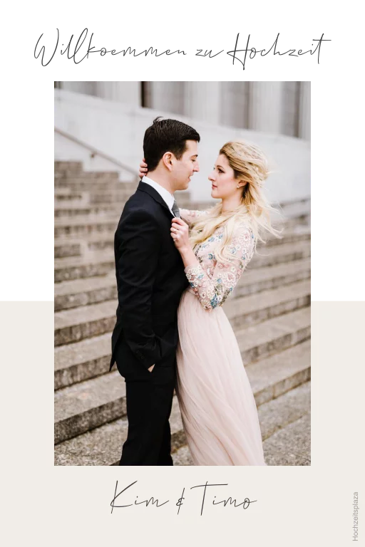 Modernes Willkommensschild für die Hochzeitsgäste mit Foto. Das Schild im Hochformat ist schlicht gehalten und hat die Farben Weiß und Beige. Es ist 40x60 cm groß.