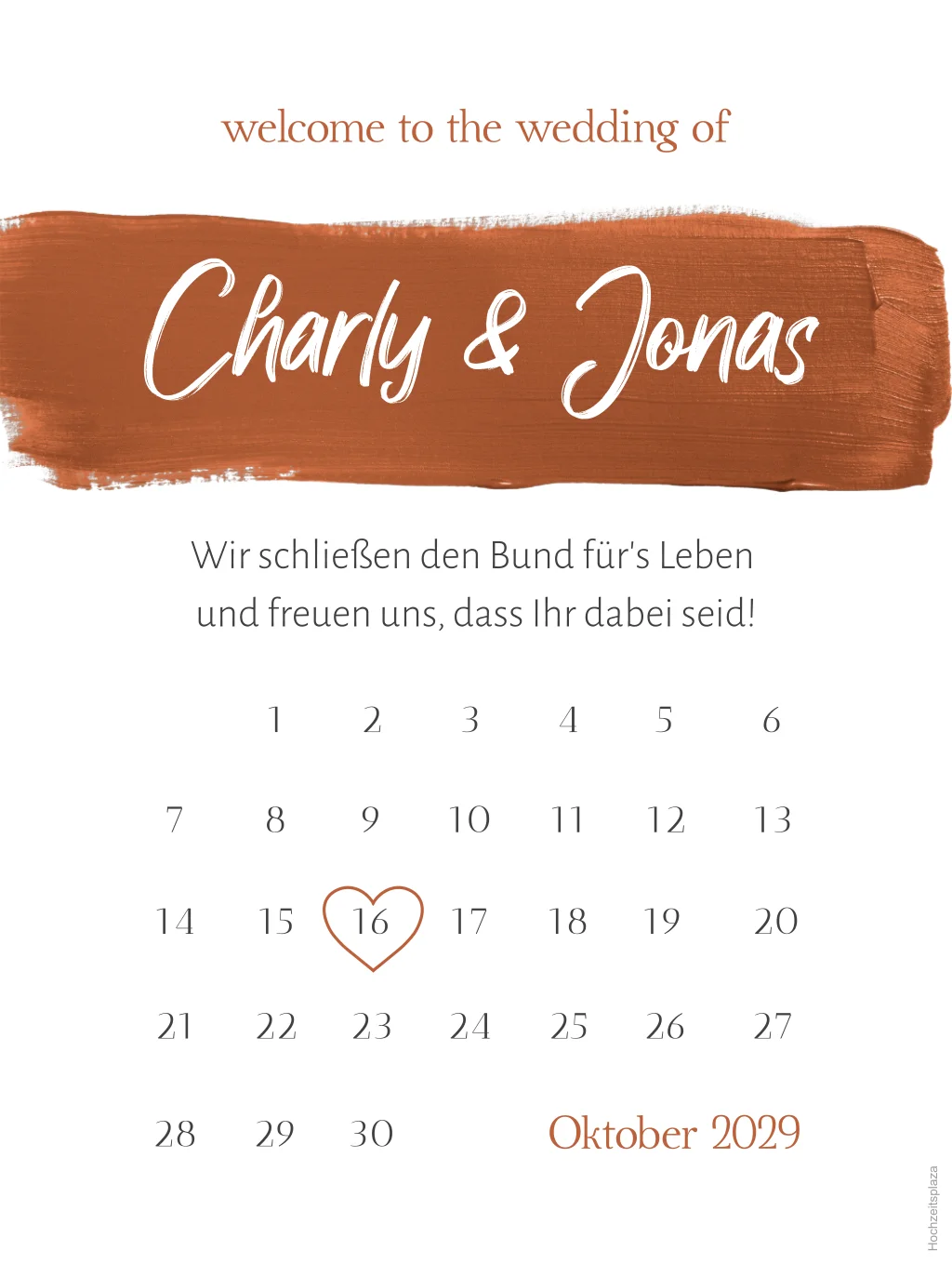 Willkommensschild zur Begrüßung der Hochzeitsgäste mit Pinselstrich und Kalenderblatt in Kupferfarben in 55x73 cm.