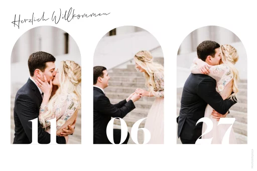 Modernes Willkommensschild zur Hochzeit mit Fotos in Bogenrahmung