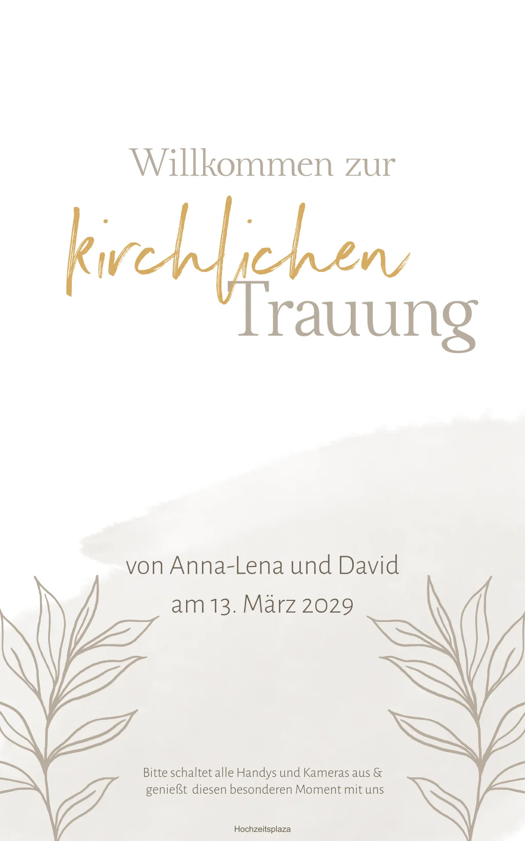 Modernes Willkommensschild zur Begrüßung der Hochzeitsgäste für die kirchliche Trauung. Das Schild in Bogenform in 46 x 73cm mit Aquarell in beige ist mit zarten Zweigen verziert.