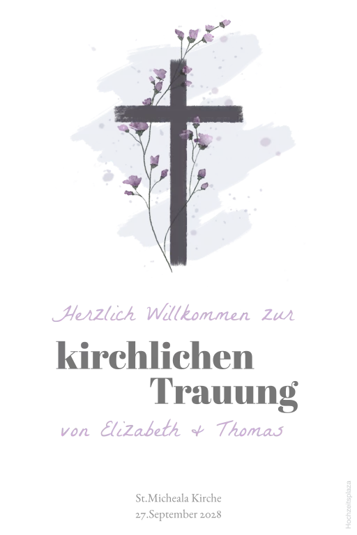 Weißes Willkommensschild zur kirchlichen Trauung mit Kreuz in lila in 40x60 cm. Das Schild im Hochformat hat lila Akzente und Blüten.