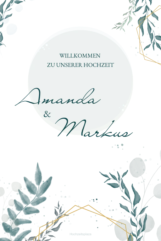 Greenery Willkommensschild für die Hochzeit mit Goldelementen in blau grün in 40x60 cm
