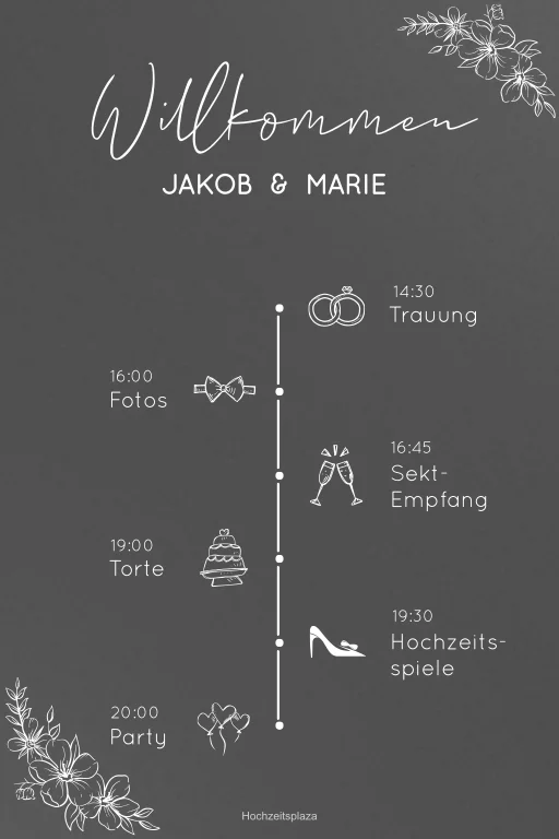 Für die Hochzeitsfeier: Willkommensschild mit Icons-Zeitstrahl im Schiefertafel-Look im Hochformat. Das Schild hat eine Größe von 40x60 cm. Unsere Willkommensschilder werden auf Forex gedruckt, welches ein 5mm dickes, wetterfestes Plattenmaterial ist, das Sonne und Regen sehr gut standhält. Die Folierung ist leider auf diesem Material nicht möglich.