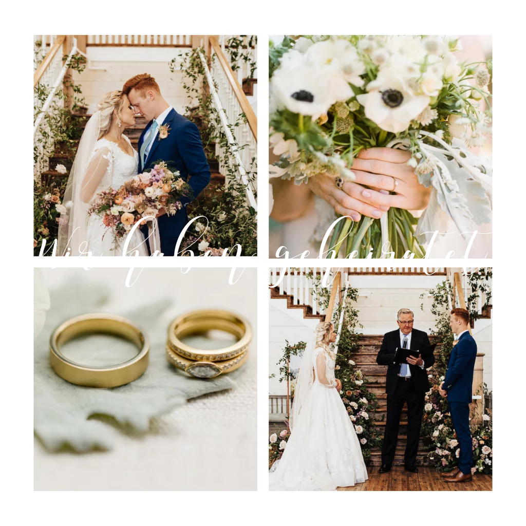 Quadratische Wir-haben-geheiratet-Karte in weiß mit Fotos in Rahmung.