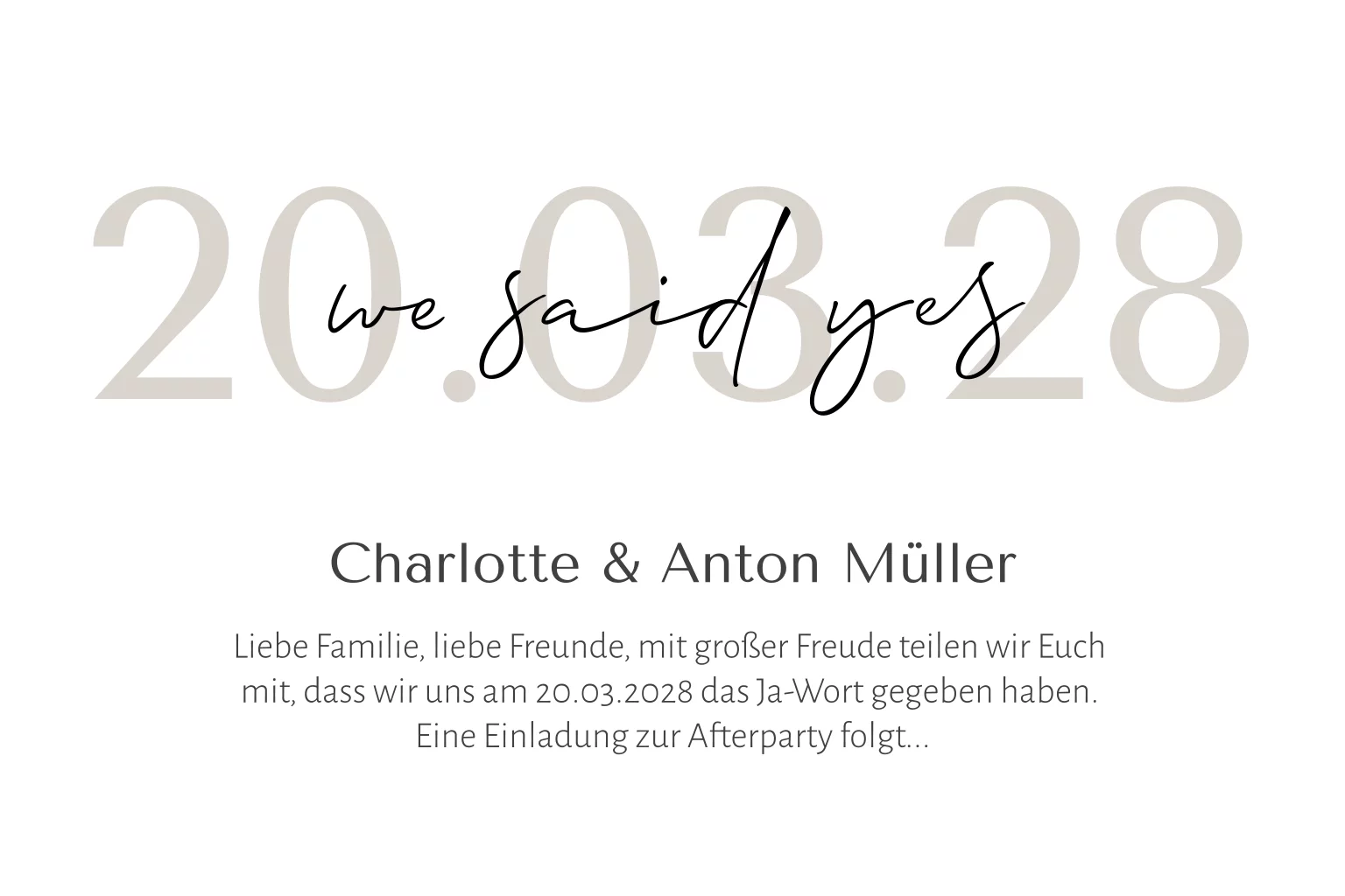Schlichte Wir haben uns getraut Fotokarte in weiß mit Datum in beige